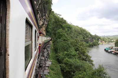 火車喀隆喀隆穿梭田野間,途中有人幫忙拍照,製作成車票發售。還有零食,飲品小販穿梭車廂。約 1.5小時後,到達Tha Kilen 站,好多join tour 的人上車,全車滿座,一同經歷列車通過懸崖,當年戰俘搭成的橋道。